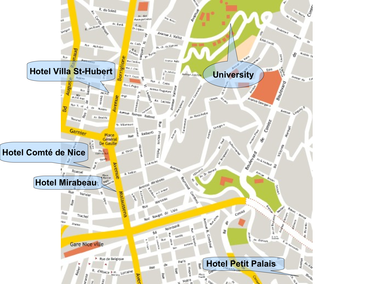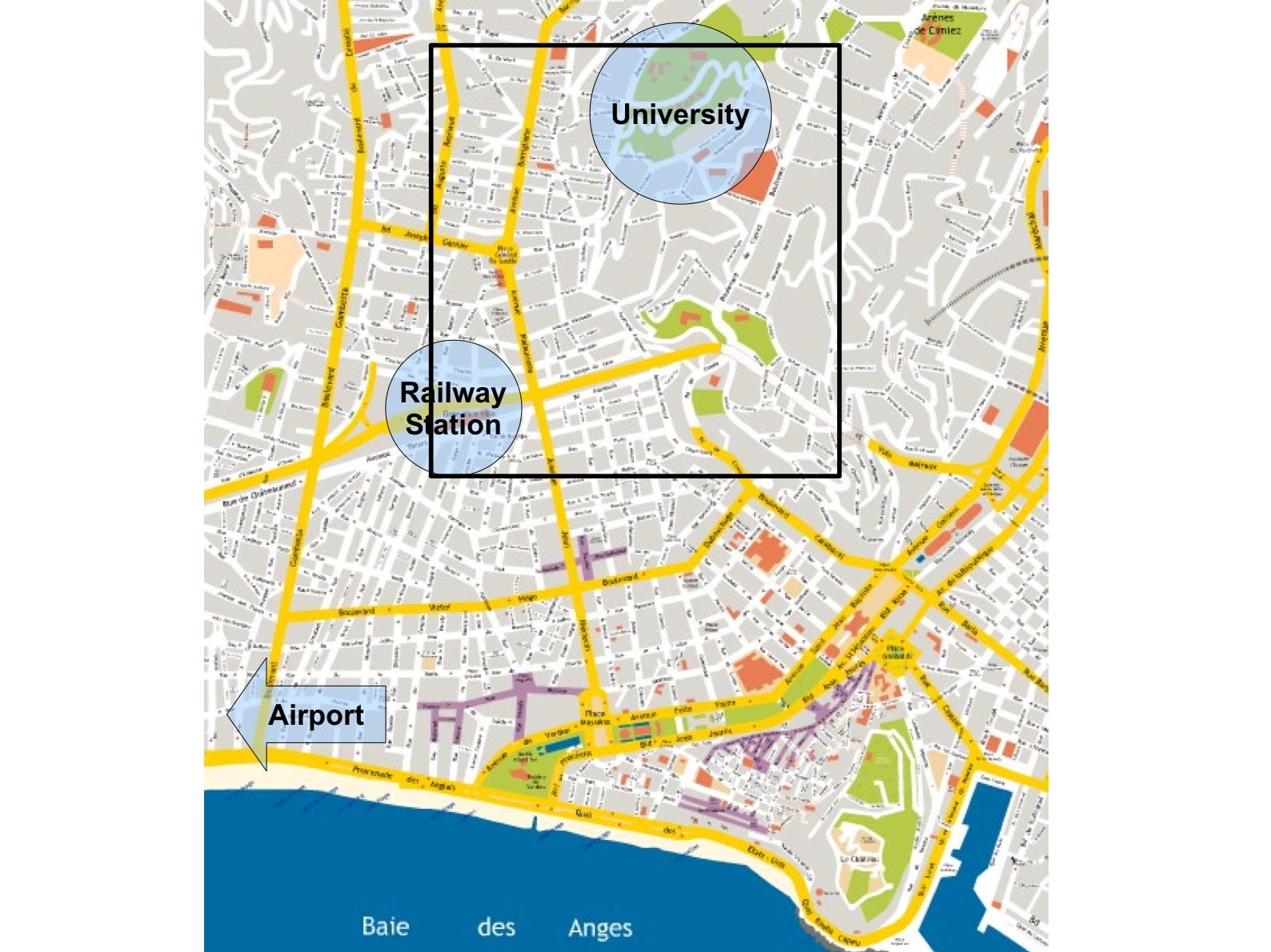 Carte de Nice avec les emplacements de l'université, de la gare et la direction de l'aéroport