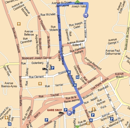 - Prendre l'Avenue Thiers à gauche en sortant de la gare jusqu'au Tram.